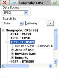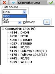 The drop down list of the section Data Source allows EPSG data consultation to be switched to user data and vice versa.