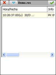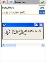 ·Info: Datos del punto replanteado según la opción de replanteo seleccionada. Ésta se indica con un código (p.e. _020_) al final de la línea de información. Dicho código se puede consultar en la tabla en del apartado datos GPS en Gestión de Ficheros.