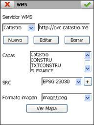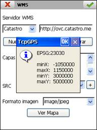 Para ello es necesario conectarse a un servidor e indicar las capas, el sistema de coordenadas y el formato de imagen (en la versión actual de TcpGPS sólo se permiten imágenes JPEG). El programa realiza las consultas de estos elementos a través de la siguiente pantalla: