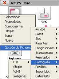 El programa permite utilizar, en las diferentes opciones de toma de datos y replanteo, ficheros de cartografía con diferentes formatos, así como trabajar en tiempo real con los servicios WMS (Web Map Service) si se dispone de conexión a Internet.
