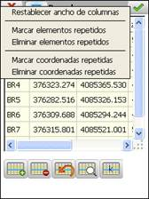 Estas opciones permiten restablecer el ancho por defecto de las columnas y localizar y eliminar puntos que tienen igual número o coordenadas.