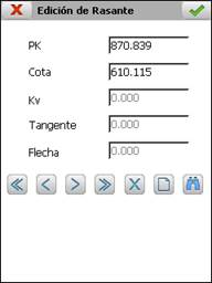 En la entrada manual de datos se calcula automáticamente el Kv o Radio, la Tangente y la Flecha al introducir uno de ellos. Dependiendo del tipo de acuerdo del fichero de rasantes se muestra por pantalla el Kv (acuerdo parabólico) o el Radio (acuerdo circular). El valor del Kv debe ser siempre positivo.