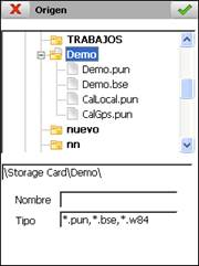 Los ficheros deben ser de tipo punto (*.PUN) o base (*.BSE). Para los datos origen también se admiten los ficheros de coordenadas geográficas con extensión *.W84, creados en la opción Gestión de Ficheros > Datos GPS.