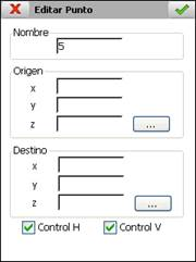 Si se introduce un punto manualmente se debe indicar el Nombre, las coordenadas Origen y Destino y si se utilizará para planimetría, Control H, altimetría, Control V, o en ambos casos. También es posible editar los valores de estos parámetros para cualquier punto sea cual sea el método de inserción.