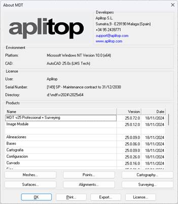 By clicking on the Mesh, Points, Cartography, Surfaces, Alignment and Surveying buttons, details about the installed file formats and their respective versions are displayed.