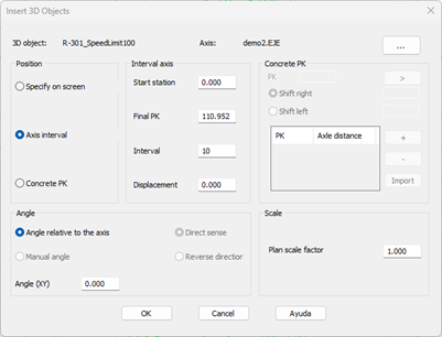 Alignment interval: We indicate at what interval the object is to be inserted with respect to the alignment. We set the Initial Station, Final Station, Representation Range, and Offset with respect to the alignment (a negative value means to the left of the alignment).