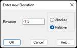 The value of the new height desired is entered in Elevation and whether the elevation adjustment is to be Absolute or Relative, that is to say, whether it is to be changed to the elevation actually entered or to be increased with respect to the existing elevation.