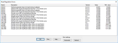 This command checks the geometrical characteristics of a horizontal alignment, in accordance with the road regulations configured in the program.