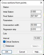 Regression strip: Defines the interval according to which MDT will project the points found to the left and right of the horizontal alignment that will comprise the cross-section profiles.