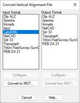 Likewise, if any format on the Output Format list is selected, the Convert from MDT button will automatically be enabled. If it is clicked, the program will request the source file containing the MDT vertical alignment and then for the output file where the vertical alignment information will be sent with the format selected. Optionally, the Configure button