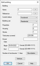 If we edit the building, in the editing window you can see the islands contained in the building, as well as the total area associated with them.