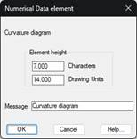 This numerical data element can only be represented if a segment has been selected. It calculates the curvature diagram of the horizontal alignment associated to the segment and then draws it. The dialog box shown below is then displayed A description of its characteristics follows.