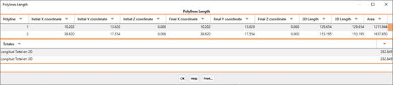 Once the polylines have been selected, the program will show us a list with this information in addition to other parameters such as the initial and final coordinates and the area of the polyline.