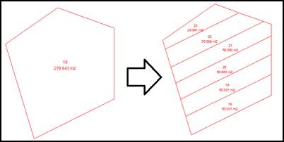 This tool allows us to divide plots parallel to the indicated side. The division can be made by area of the plots to be created, number of plots or distance to the selected side. The steps to follow are: