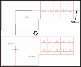 In the following image you can see how a set of plots are divided automatically from the intersecting polyline.