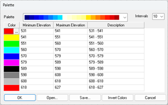 The Color Palette button shows the following dialogue which shows the elevation ranges, the color assigned and the different palettes available for assignment. The default configuration for intervals and the color palette may be edited in Map Configuration.