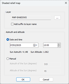 Layer: Layer on which the calculated image with the shadows will be drawn. If we select the Add suffix to layer name checkbox, the layer name will be assigned a suffix with the selected azimuth and time.