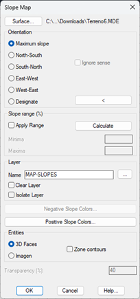 Zone contours: If we activate this option, each of the groupings made according to the classification of slopes made in the color palettes will be delimited with closed polylines.