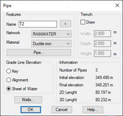 Trench: We also have the option of drawing the trench if it hasn´t been drawn. By unchecking this box, the edited pipes will be redrawn without the polyline in relation to the trench.
