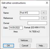 19.22. Edit Pool As with editing Buildings, with this command you can edit the properties of a Pool. The parameters Name, Reference and Date are those that directly affect the export to GML.