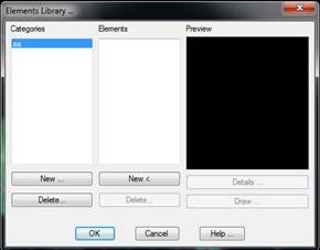 By clicking on the list of elements included in the category, a preview may be seen on the right-hand side of the dialog box. The element may be eliminated from the library by clicking on the Delete button, or it may be included in the drawing by clicking on Draw, in which case a dialogue box appears requesting the azimuth and Station coordinates for the point of origin.