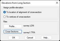 This command enables changing the elevations of the cross-section cuts in terms of the long section. This option is particularly useful to equalize the cross-sections alignment elevation with that of the long section.