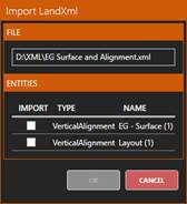 Open: Asks for a ras, lon or LandXML file and adds it to the panel and the CAD view. In case of importing a vertical alignment from a LandXML file that has more than one vertical alignment, the following dialog will be shown so that we can choose the desired alignment: