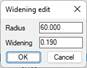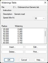 Executing this command will open a window containing the widenings table for the file in question. This window contains a list comprising the Radius and Widening columns in accordance with the speed selected.
