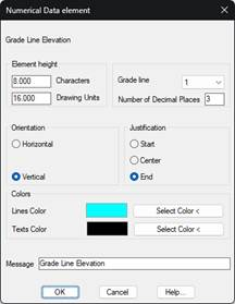 This numerical data element will only be drawn if the segment contains a defined grade line. It represents the grade line heights of the grade line contained in the segment selected. The dialog box shown below is then displayed A description of its characteristics follows.