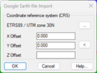 This command performs the opposite step to that of Export Entities to Google Earth, draws the contents of a Google Earth KML or KMZ file in the CAD. First, a window appears in which you specify the coordinate system of the drawing. By default, the SRC will be automatically populated in the event that the drawing has one assigned.