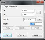 Azimuth. Straight line’s azimuth, in hundredths of a degree. Its value may be typed into the relevant box or it may be designated graphically with the < button situated to its right.
