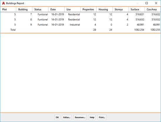 This shows a list with the information of all existing buildings in the drawing, as well as showing the attributes that can be seen when editing buildings. The plot to which each of the buildings belongs is also shown.