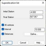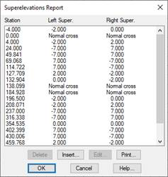 Print: Transfers the superelevation information to the system’s printer or to a text file.