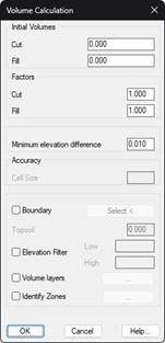 When executing this command, first of all, the program shows a dialogue box where you can enter some Initial Volumes for cut and fill, which the program adds to the final calculation result. You can also introduce factors that multiply the volumes obtained.
