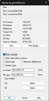 One can obtain a graphic representation of the results by activating the Draw Volumes check box. This consists of a mesh that is only defined in the area defined by both mesh files. Each cell will have a color indicating if the area is in a cut, fill or whether it does not contribute to volume within tolerance set in the configuration. There is the possibility of assigning at the drawing a range of colors both for the cut and fill; with this in mind, we have the option of selecting the corresponding color palette.