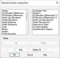 The dialog box consists of two lists. The one on the left displays the elements available and the one on the right displays the current status of the numerical data. The order latter is the order which will appear on the drawing. There are a series of controls on the bottom which help one to configure the numerical data.