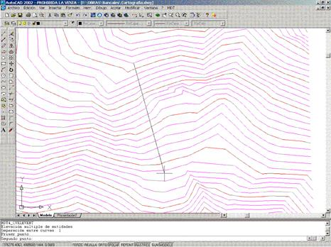 Multiple: This option allows one to raise several contour lines at the same time. The program initially requests the separation in height between successive contours and its sign. Then two points are entered, so that the line between them intersects several contour lines. Finally, the initial height is entered. With these data, the program assigns the first height to the first curve. It then successively increases the height using the separation entered and assigns it to the next contour line.