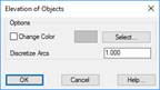 Options: A dialog box is displayed allowing one to specify the parameters affecting all the above-mentioned modes. If the Change Color option is activated, the color each object modified by this command will change color and assigned the one appearing on the right-hand side of the box. This is useful to modify large drawings, so that already processed objects can be differentiated. Additionally, the Arch Discretization box indicates the discretization value of arcs and polyline arch segments that are elevated.