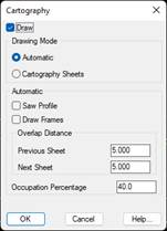 o Cartography Sheets: If this option is selected, the previously defined sheets will be projected in the profile drawing with the command Long Section > Drawing > Draw Cartography Sheets.