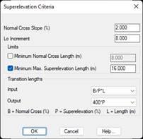 A series of values which are needed to generate and process superelevations are configured in this window. The dialog box and its parameters are shown below.