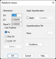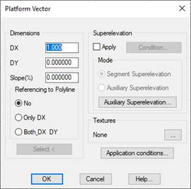 Apply superelevation: Indicate whether the vector can be superelevated. Click on the Condition button to customize the superelevation to apply.