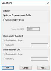 The superelevation will either be applied As per Superelevations Table or Conditioned by Slope. In the latter case, there are two criteria for the application of said slope: it can be either greater than or less than the limit set. There are two criteria for both alternatives: