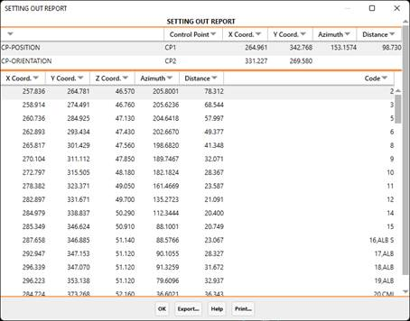 If one wishes to perform a setting out by polar coordinates, a report with the following characteristics will be displayed:
