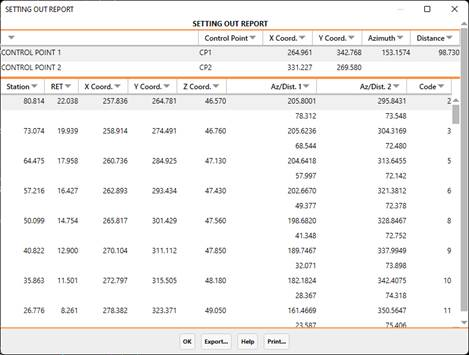 For each point selected its coordinates, the distance and azimuth to the control point and its point number are given.