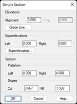 This command is used to easily set out a roadway without the need to define the segment fully. It would be ideal for setting out a section with the platform and a few simple cut and fill slopes.