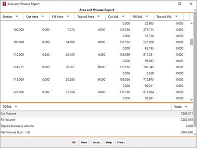 Once this window has been checked, a list will appear similar to the list of cubic measurements with all the information on the calculated areas and volumes, including the option to send the list to a printer or draw the profiles.