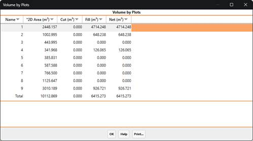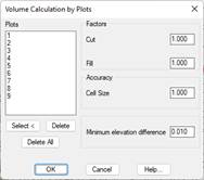 Plots: Name of the plots detected in the drawing the volume of which is to be calculated. Plots may be Selected or Deleted with the aim of customizing the list.