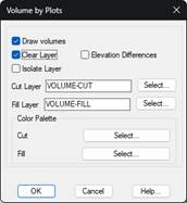 Activating the Draw Volumes box will provide a graphic representation of the results, consisting of a mesh located only in the area in which both mesh files are defined. Each cell will have a color indicating if the area is in cut, fill, or does not possess a volume within the limits defined in the settings. A range of colors may be assigned to both the cut and the fill; for this we have the option of selecting the corresponding color palette.