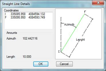 The straight line is defined by its initial (I) and final (F) points. The initial azimuth and the length are calculated automatically and they are indicated in the dialogue which is shown by pressing the Details button in the command Edit