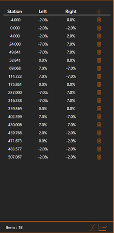 · Station: The super elevation station. We can double click it and write a new station. The list will be reordered by station after the change.